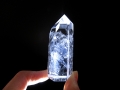 一見普通の水晶ですが、ライトを当てると非常に綺麗なブルーに輝く内包物が鮮やかに現れます。