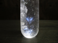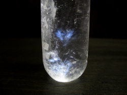 一見普通の水晶ですが、ライトを当てると非常に綺麗なブルーに輝く内包物が鮮やかに現れます。