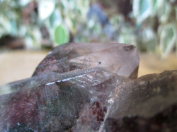 水晶の中に赤色の鉱物やクローライト(緑泥石)がファントム状にインクルージョンされ、