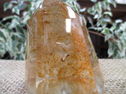 透明度抜群な水晶の中にイエローゴールドの鉱物のインクルージョンが見られる神秘的なガーデンクォーツです。